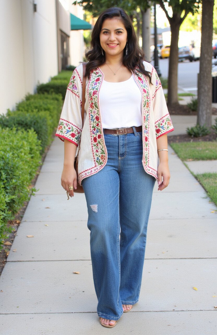 An embroidered kimono paired with high-waisted jeans offers a bohemian yet polished look. This outfit is great for casual days or attending cultural events. The kimono adds a layer of art and texture, while the jeans provide structure.