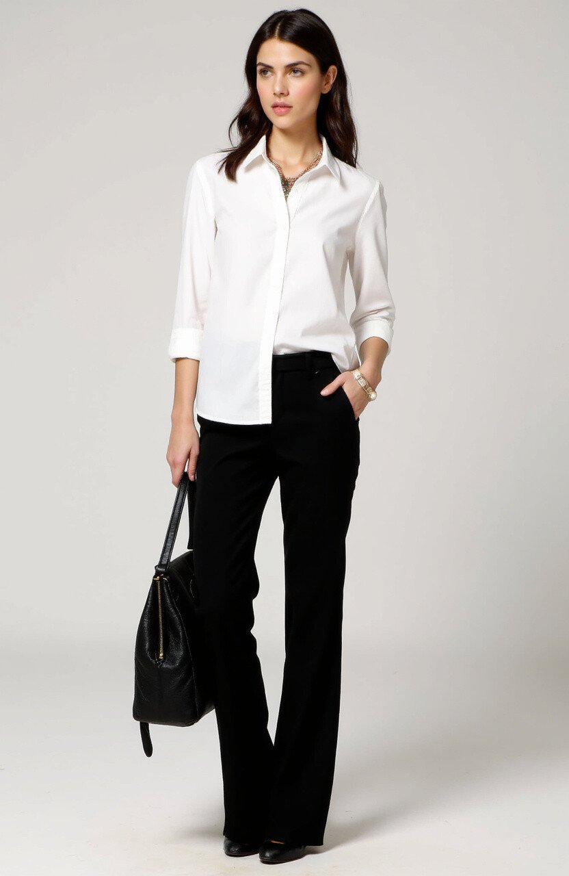 This timeless combination is like a blank canvas, allowing you to add your personality with accessories. The crisp white shirt paired with tailored black trousers exudes elegance and sophistication.