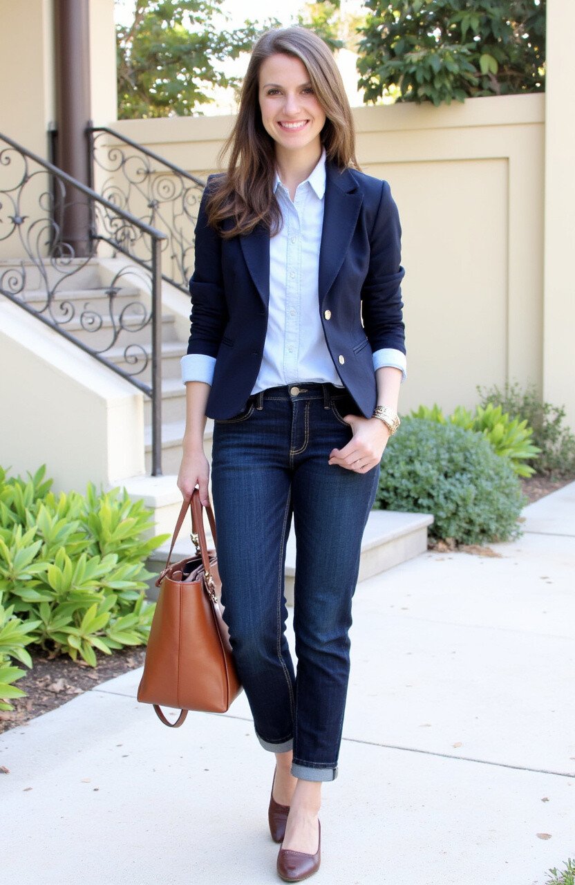 Choose dark denim for a more professional appearance and a blazer in a complementary color. This look is easy to personalize with different tops and accessories.