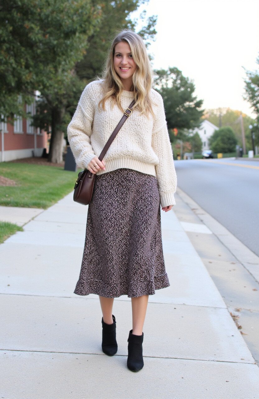 A cozy knit sweater paired with a midi skirt offers a perfect blend of comfort and style. This outfit is ideal for cooler months when you want to feel warm yet fashionable.