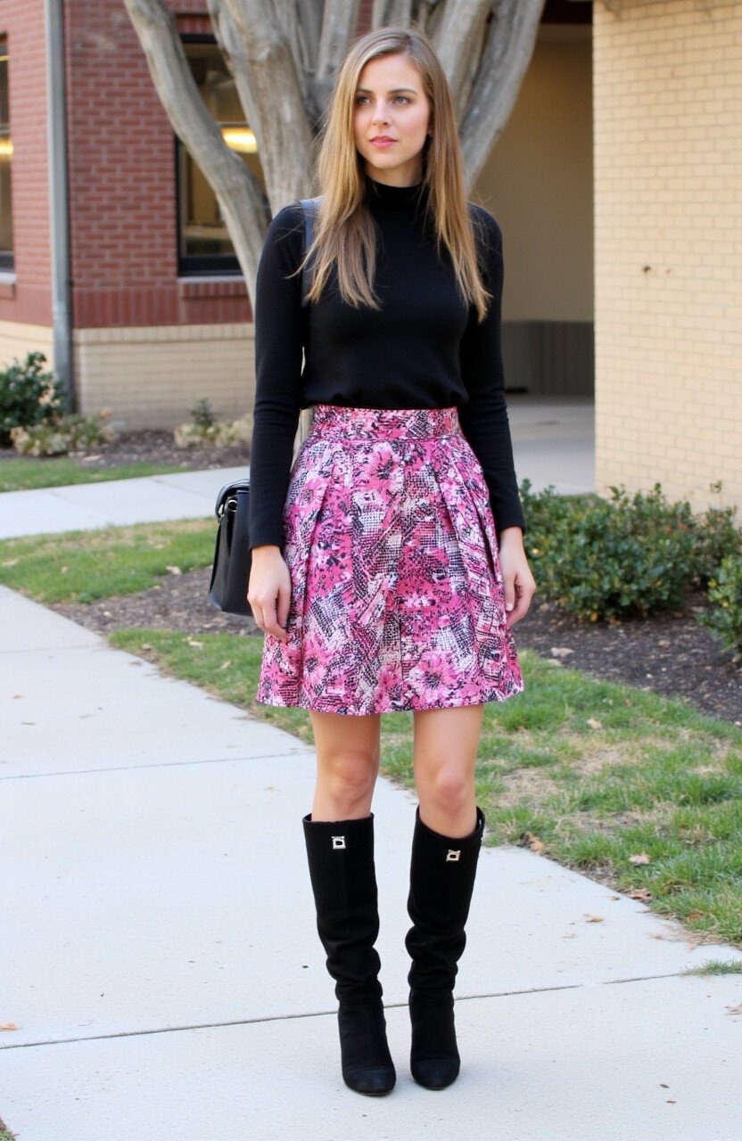 An A-line skirt paired with a turtleneck creates a classic and feminine silhouette. This outfit is perfect for fall and winter, offering style and warmth.