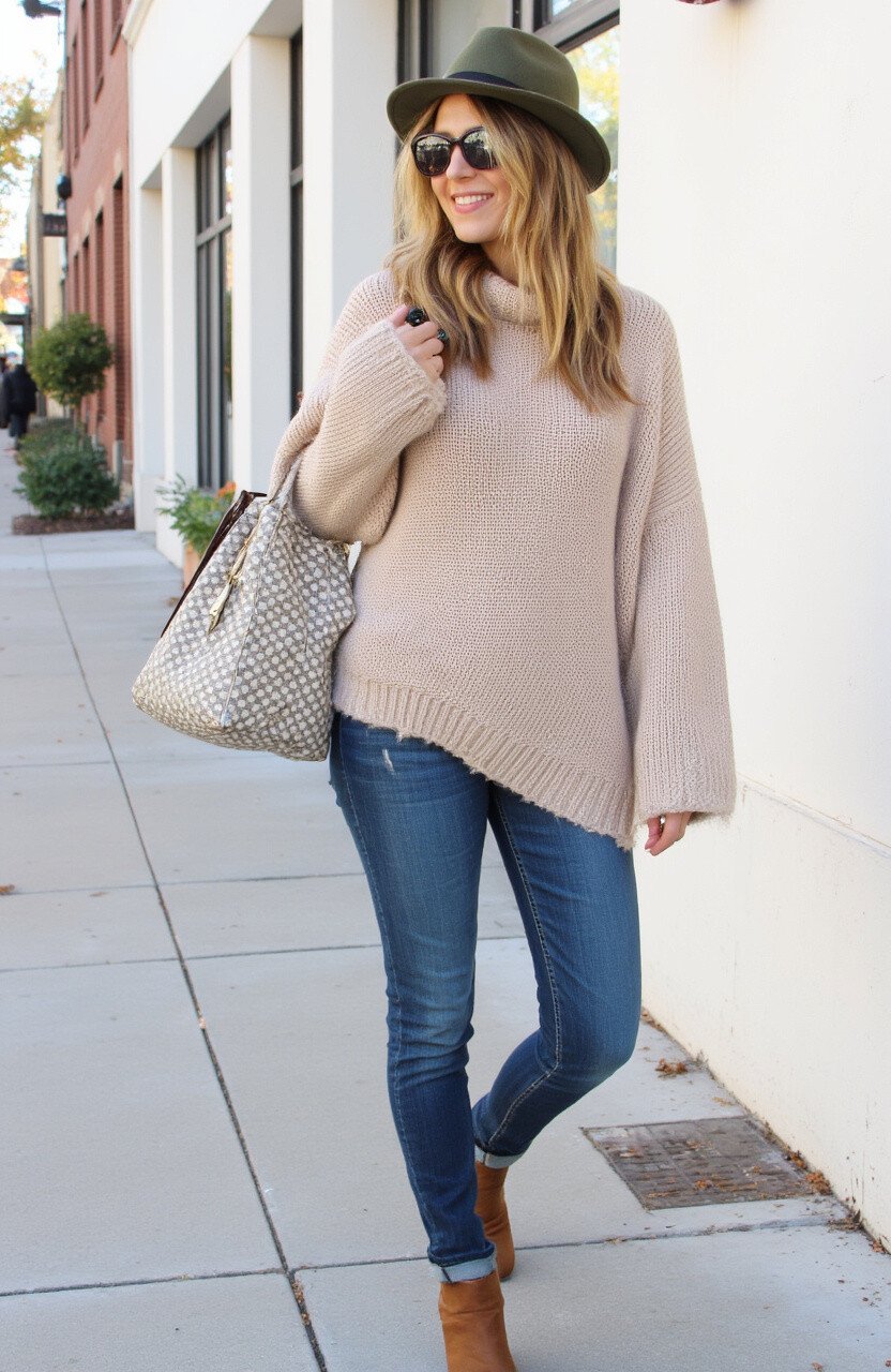 The contrast between the fitted jeans and the loose sweater creates a flattering look. Choose a sweater in a soft fabric and a fun color. Add ankle boots for a touch of elegance.