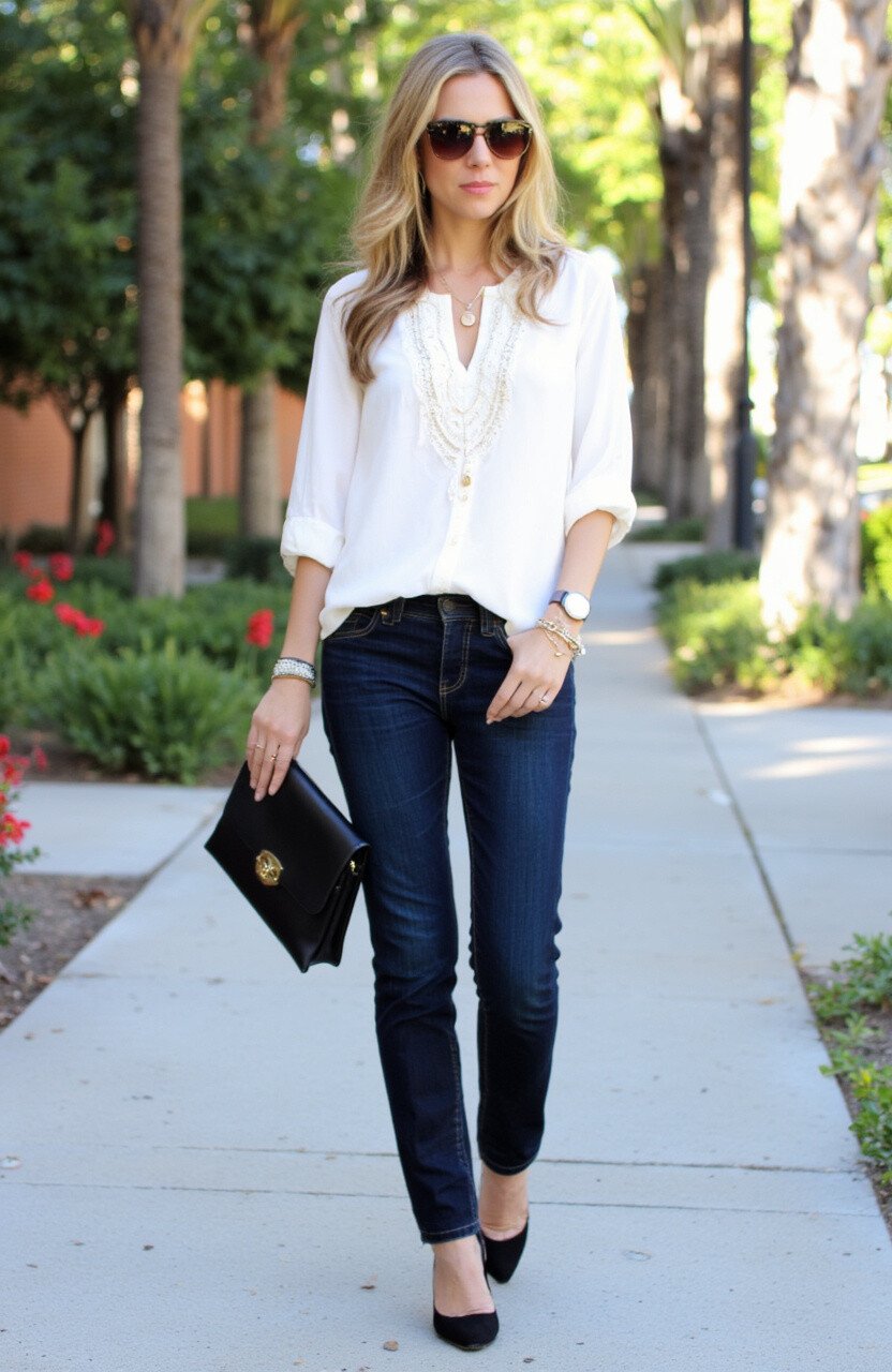 This combination is perfect for a lunch date or a day at the museum. The blouse adds elegance to the casual jeans. Finish with ballet flats or low heels.