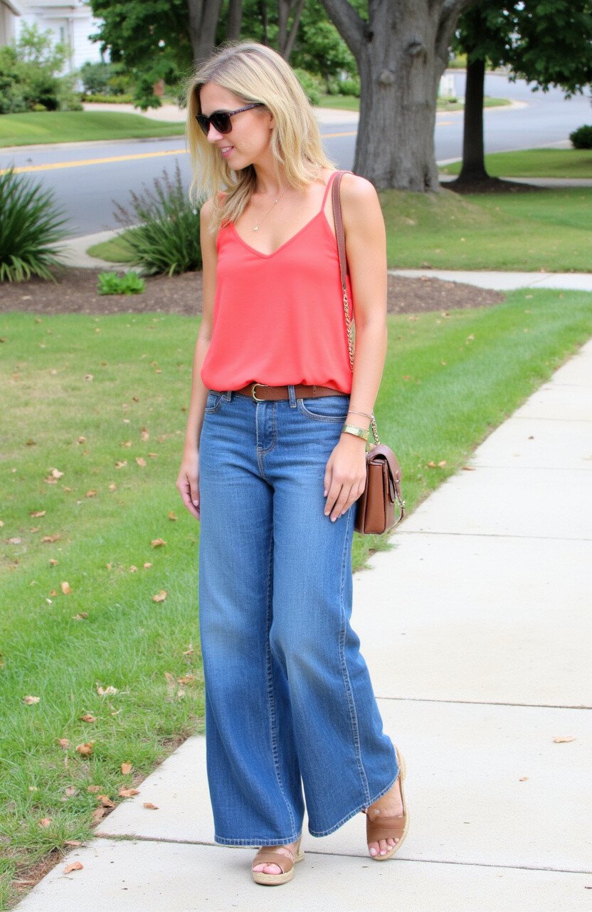 Wide-leg jeans are breezy and comfortable, especially when paired with a fitted tank top. This outfit is ideal for summer days or vacations.