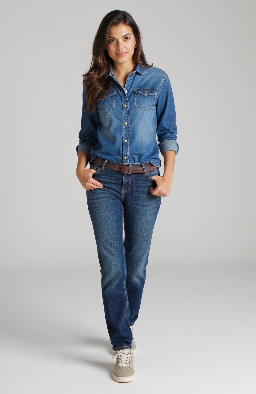 The slim fit jeans provide a sleek silhouette, while the denim shirt adds a layer of interest. Add a belt for a defined waist. Sneakers or ankle boots complete the ensemble.