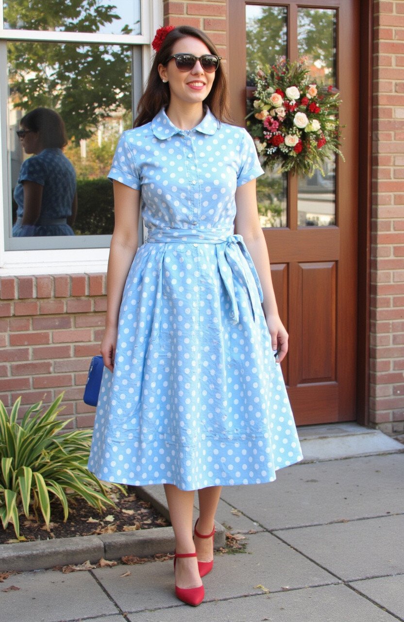 Accessorize with a wide belt and cat-eye sunglasses for that classic look. It’s a great outfit for sunny days and picnics.