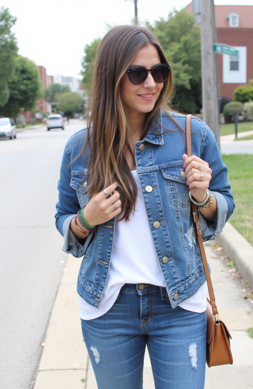 Mixing textures, like a distressed jacket with smooth jeans, can elevate this outfit. Keep accessories minimal to let the denim shine.