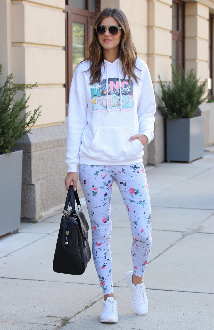 Embrace the comfort of athleisure with sporty leggings and a loose hoodie. It’s perfect for a relaxed day or a quick workout.