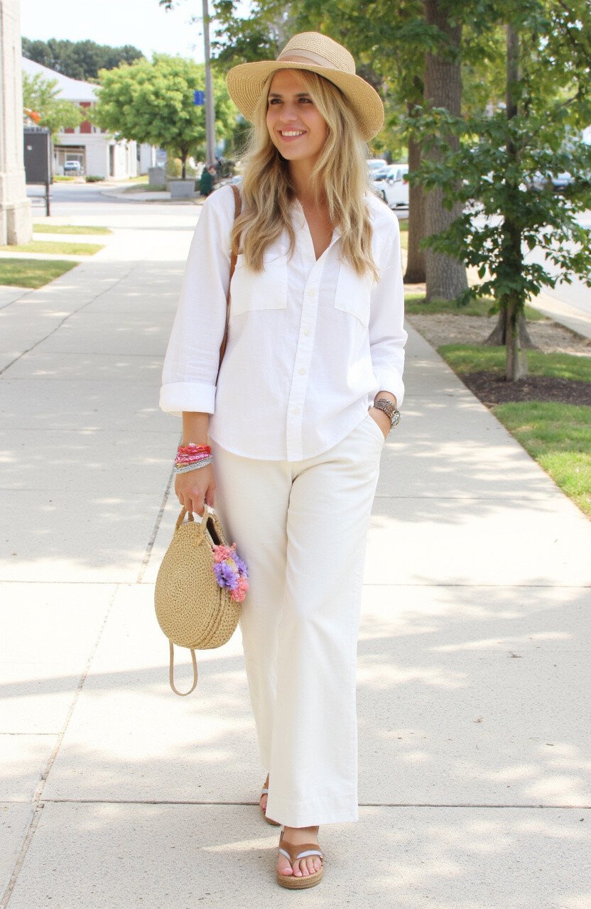 Opt for a linen shirt and pair it with loose linen pants. Add some sandals and a straw bag for an effortless look. This outfit is ideal for a beach day or a summer stroll.
