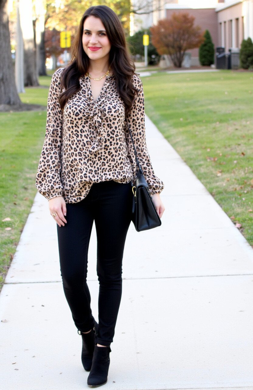 Choose a leopard print blouse and pair it with black skinny jeans. Add some ankle boots and a leather bag for a fierce look. This outfit is perfect for a night out or a stylish lunch.