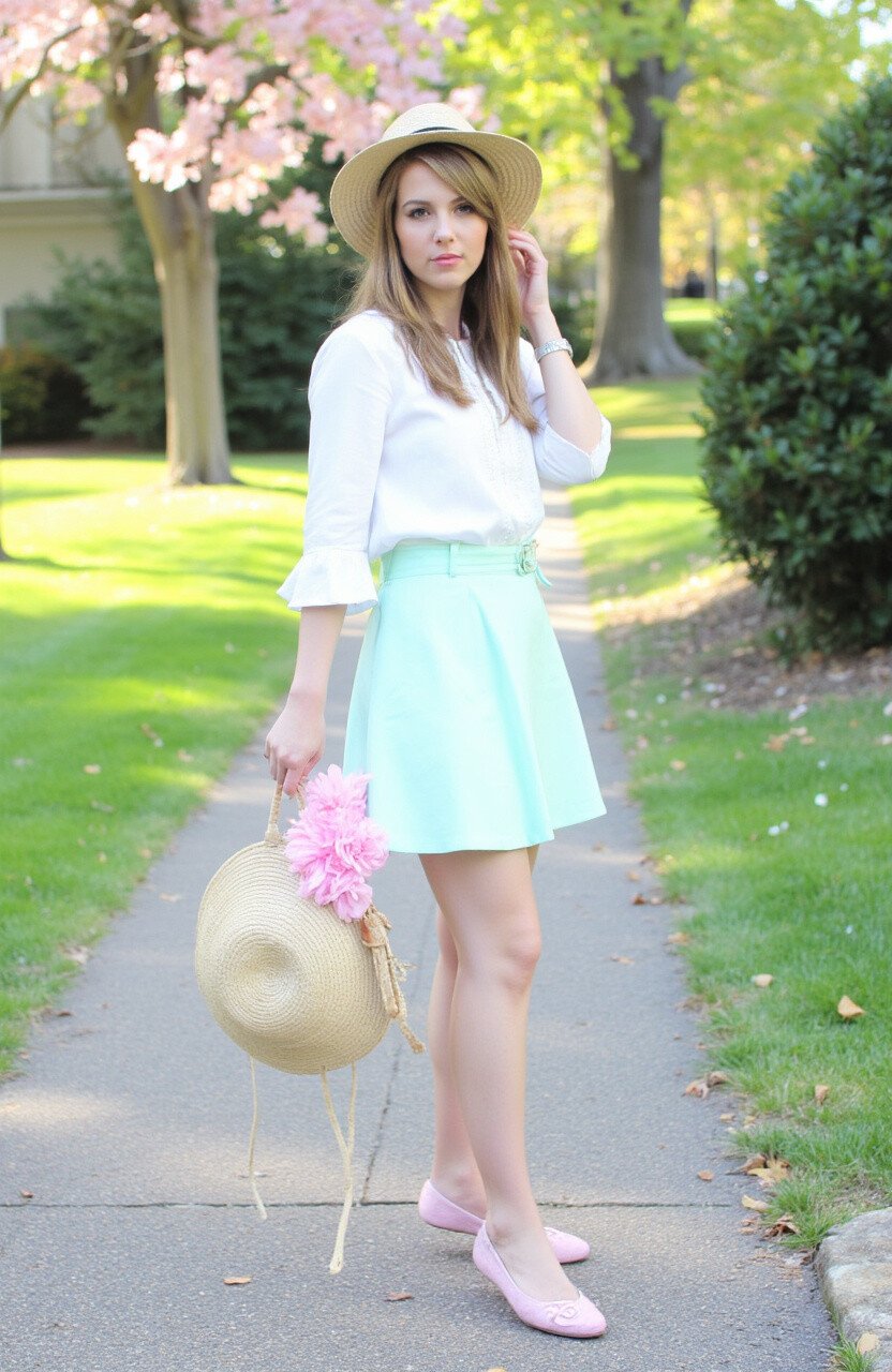 Pair a pastel-colored blouse with a flowy skirt. Add some ballet flats and a straw hat for a playful vibe. This look is perfect for a picnic or a casual day out.