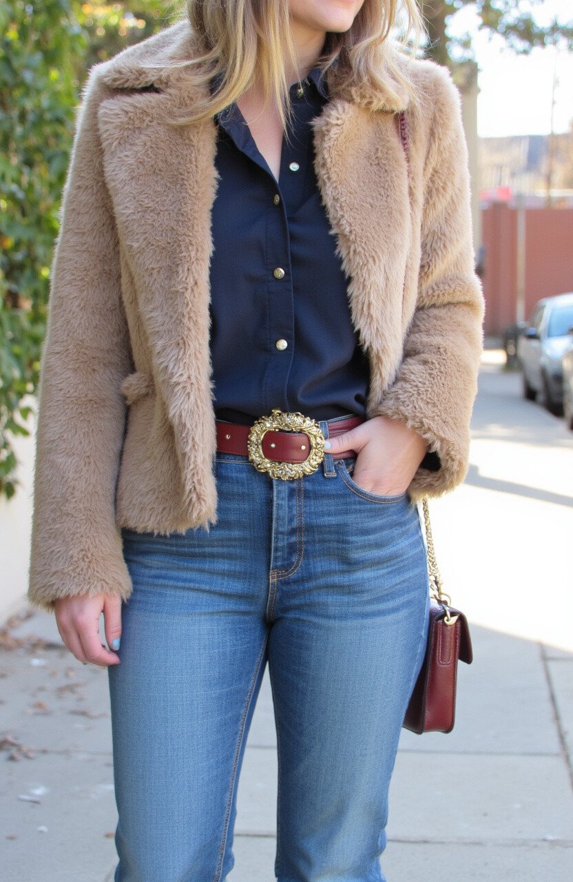 Add a touch of luxury with a faux fur vest. It’s an easy way to make your outfit look posh and feel cozy.