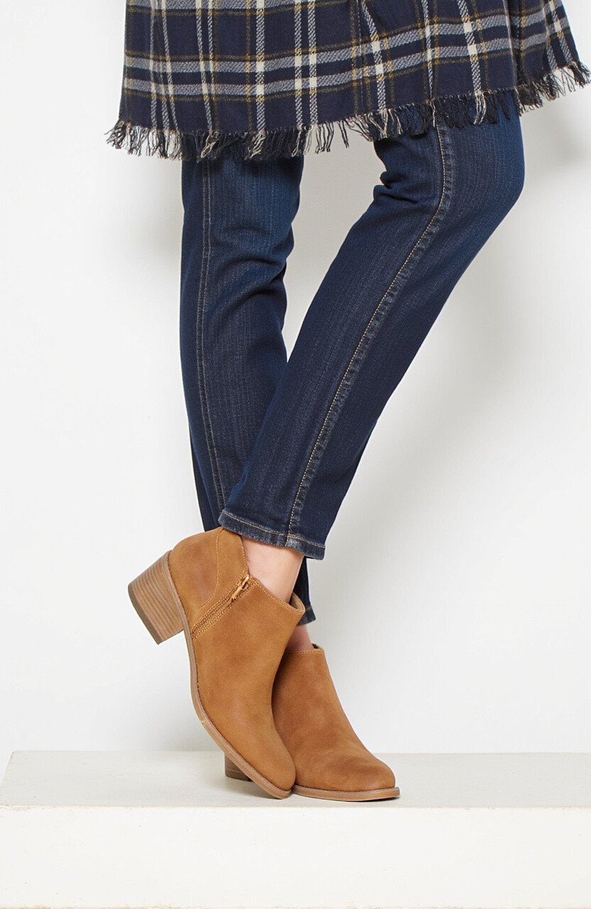 Opt for ones with a low heel for comfort. Earthy tones like brown or tan add a warm touch to your outfit.