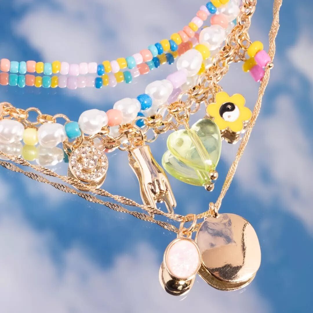 Vibrant necklaces sparkle. Colors pop. Pastel beads shine, drawing attention. Delicate chains add elegance. Playful charms, like flowers and hearts, bring joy. Each element tells a story.