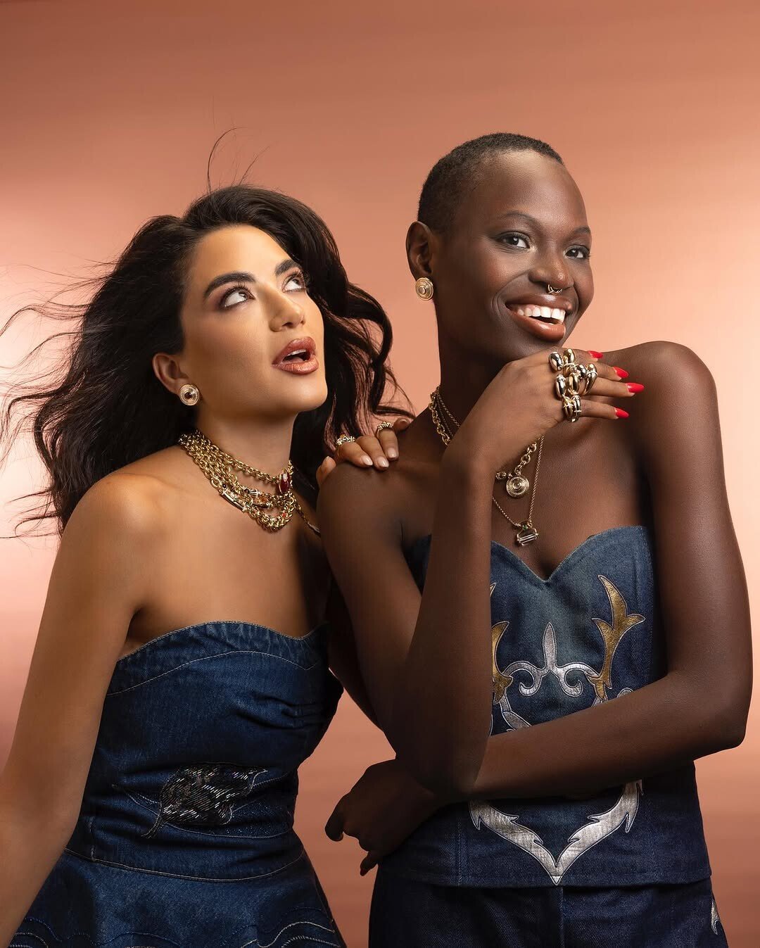 Two stylish women shine in this image. Both wear denim, a fabric linked to casual fashion and cultural expression. Long-haired woman has playful vibes, showing confidence. Her intricate jewelry stands out, signaling individuality. Short-haired woman beams with happiness. Her statement accessories add flair and personality.