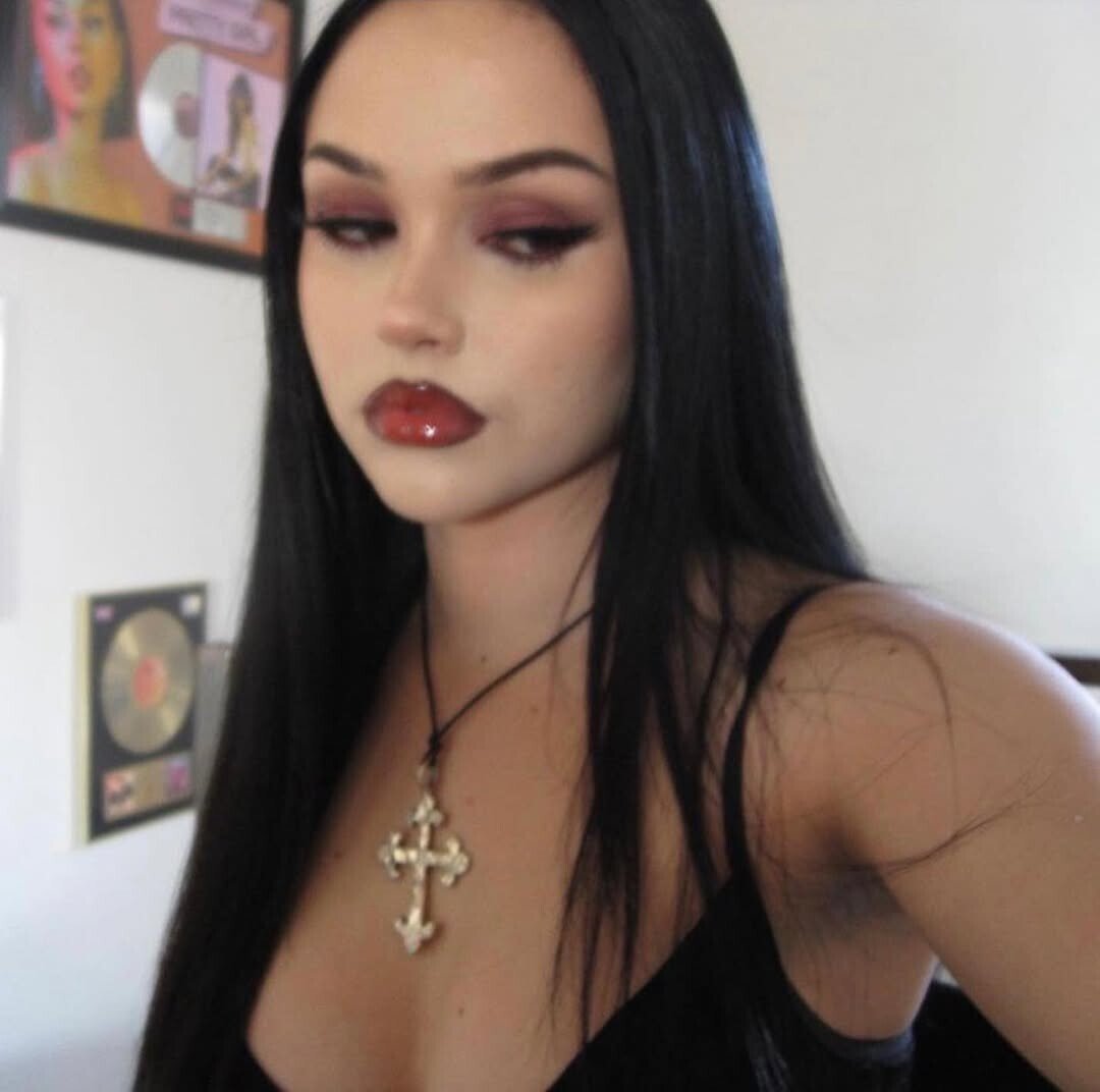 Young woman stands out. Long, straight black hair frames her face. Dark outfit adds depth. Cross necklace shines brightly, hinting at personal beliefs or cultural identity. Smoky eye makeup enhances features, while glossy lips bring a touch of modern glam. Background softly blurs, diverting attention to her.
