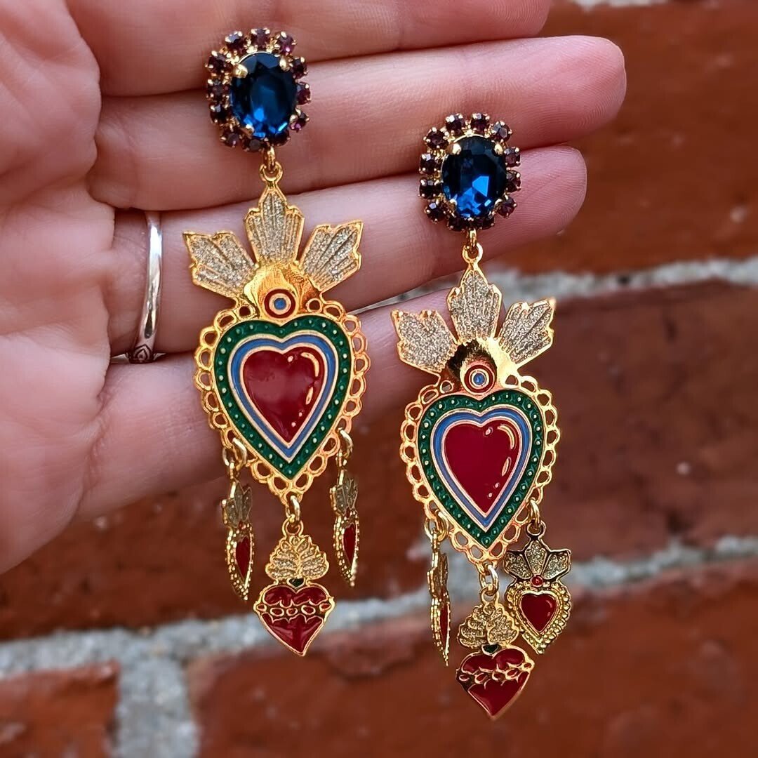 Earrings shine bright. Golden designs catch the eye. Flowers and hearts intertwine beautifully. Bold red centers pop against green accents. This color choice symbolizes love and nature. Top blue gemstones add sparkle, creating contrast. Dangles move gently, adding charm and playfulness.