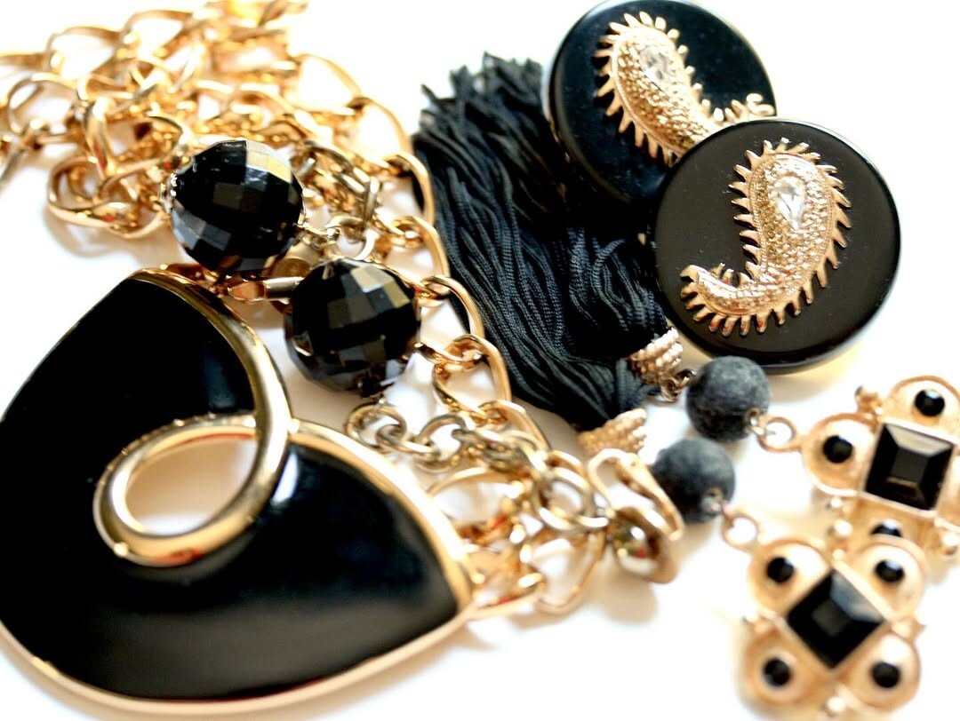 Jewelry shines in elegance. Gold-toned chains catch light beautifully. Black and gold circular earrings stand out. Their intricate designs show skill and artistry. Sparkling black beads add a touch of glam. These pieces don’t just accessorize; they tell a story of style and sophistication.