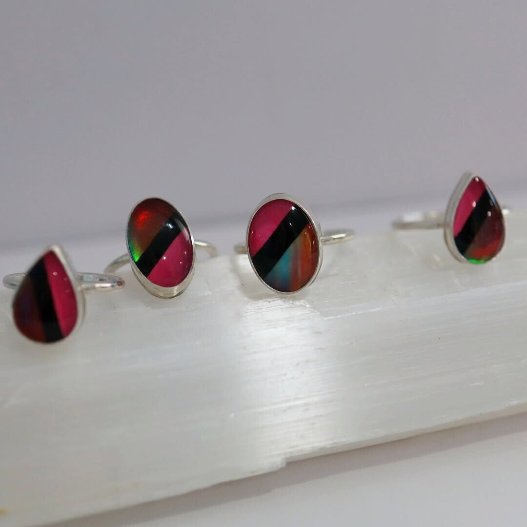 Rings shine bright. Teardrop stones catch attention. Colors pop—pink, black, iridescent. Each stone unique, showcasing nature's art. Silver bands add elegance. They frame stones perfectly, enhancing beauty.