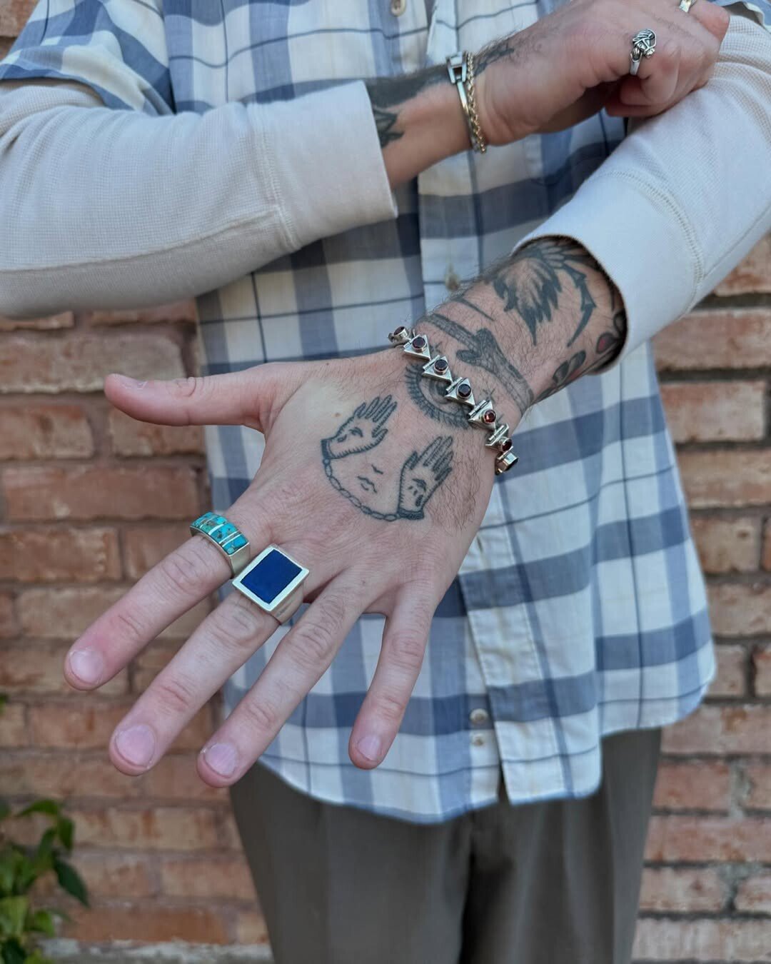 Tattooed hands tell stories. Each inked design holds meaning. Multiple rings add flair. A rectangular blue and silver ring stands out, symbolizing uniqueness and style. Turquoise band hints at nature and connection.