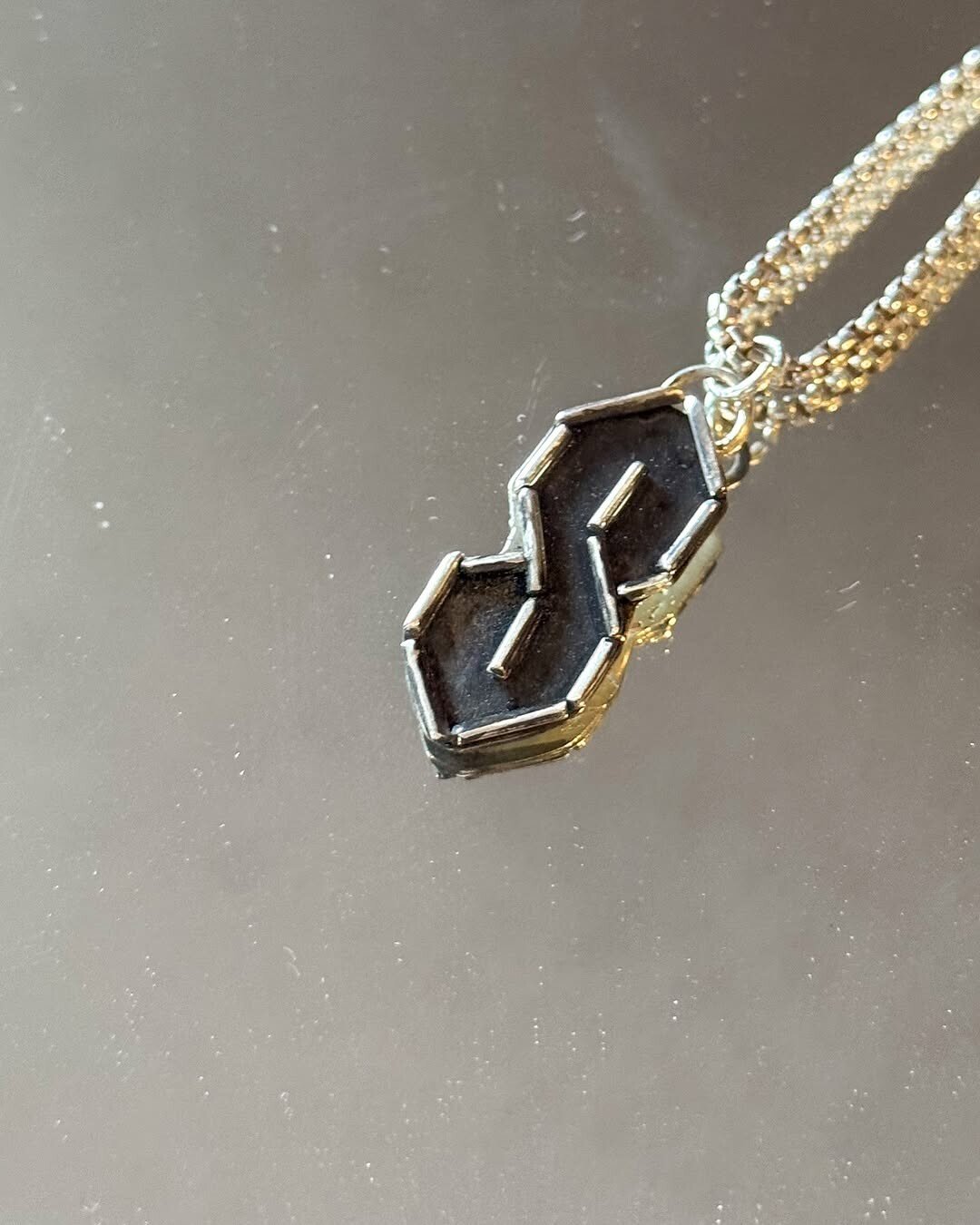 Silver chain necklace shines. The angular "S" pendant stands out. Glossy black surface draws attention. Metallic outline adds contrast. This design showcases modern jewelry trends, blending simplicity with boldness.