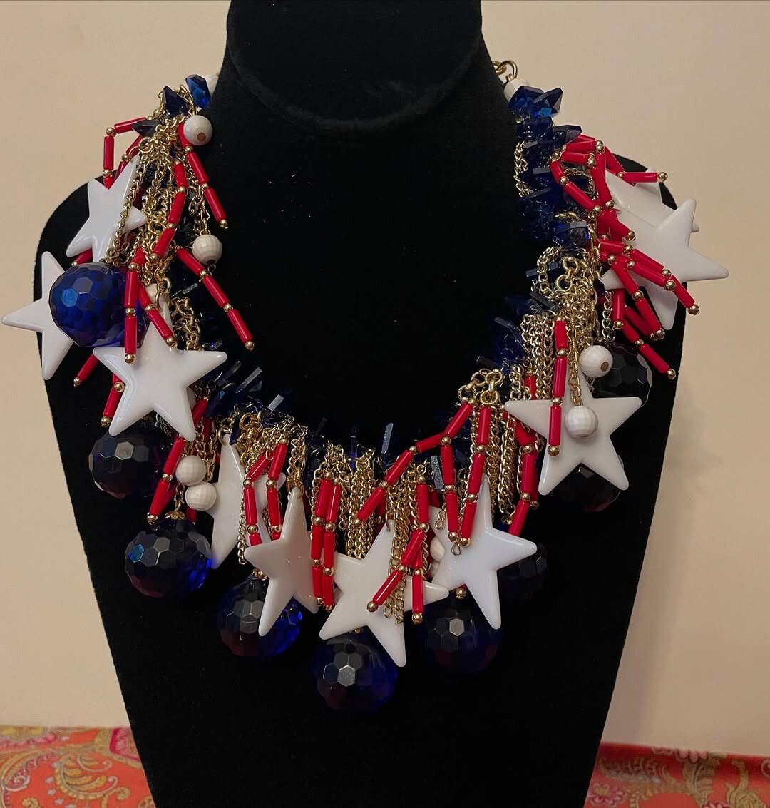 Vibrant statement necklace shines brightly. Alternating white star-shaped charms catch attention. Deep blue faceted beads add depth. Red tubular accents inject energy. Multi-chain base creates texture and movement. Design feels festive and playful, evoking a patriotic theme.
