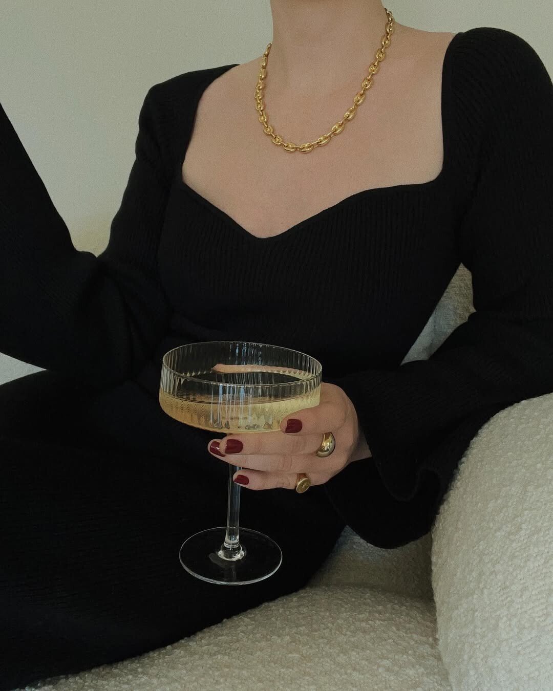 Sleek black dress stands out. Square neckline highlights elegance. Chunky gold chain adds boldness. Glass of bubbly drink suggests celebration or luxury. Reclining on a textured light-colored sofa creates contrast. Sofas often symbolize comfort and relaxation.