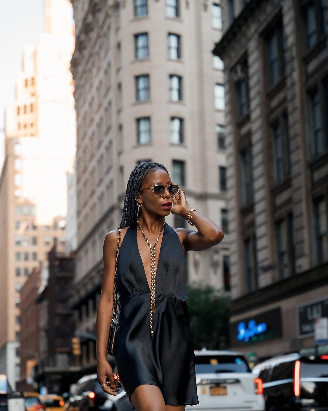 A fashionable individual walks confidently. Long braids flow elegantly. Sunglasses add a cool touch. Dressed in a sleek black outfit, style meets sophistication. Busy city streets surround. Tall buildings tower overhead. Vehicles zoom by, creating a lively atmosphere.