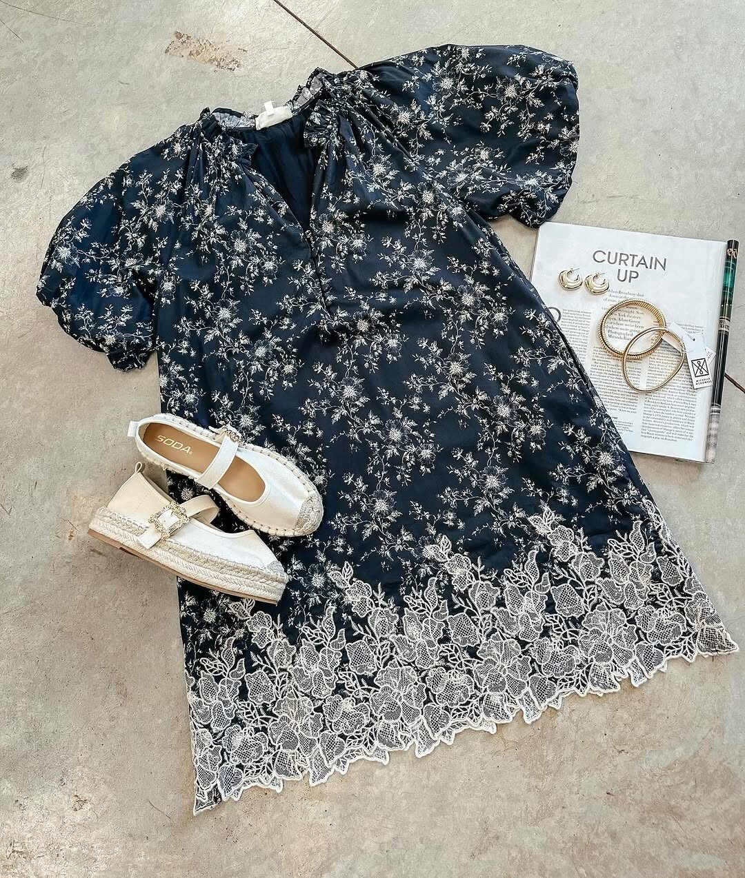 Navy blue floral dress stands out. Puffed sleeves add charm. Lace hem gives a delicate touch. Such details highlight femininity in fashion. White shoes complement the dress perfectly. They offer a fresh contrast, enhancing the overall look.
