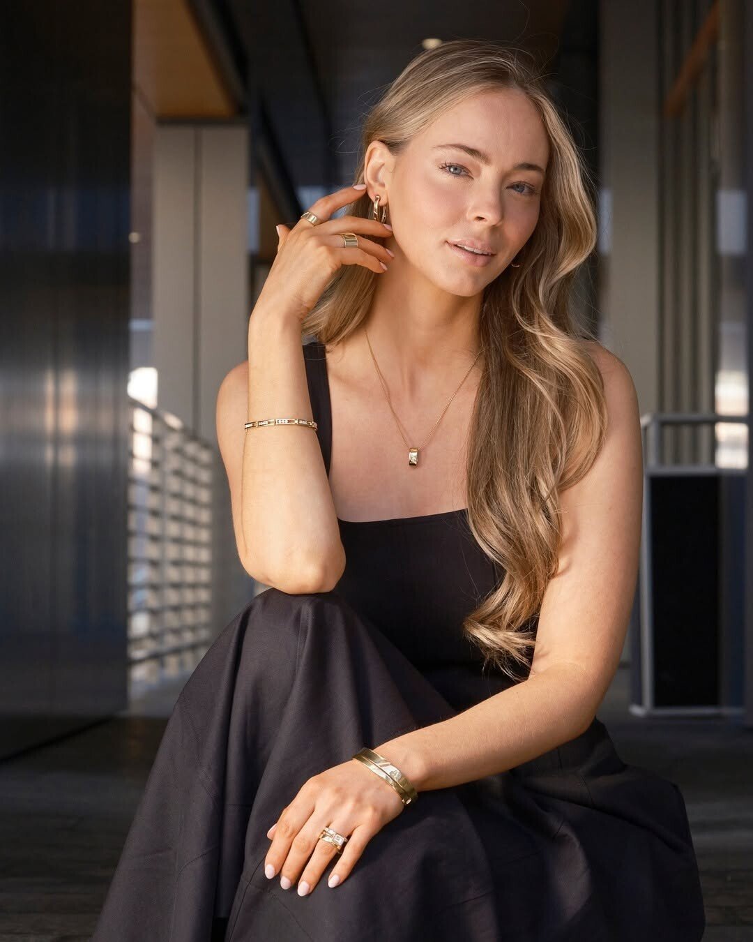 A woman with long, wavy blonde hair captures attention. Stylish black dress hugs her form. Jewelry sparkles gently, adding elegance. She sits gracefully, embodying confidence. Modern architecture surrounds her. It creates a sophisticated vibe.