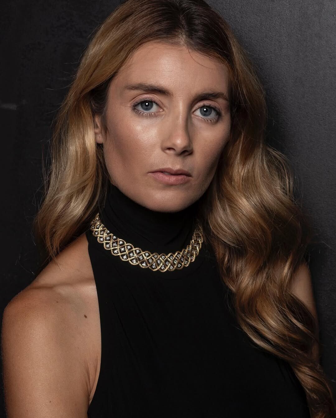 Striking young woman. Long, wavy blonde hair. Piercing blue eyes. High-neck black top. Gold decorative necklace glimmers against darkness. This image captures elegance and somberness. Expression reveals depth.