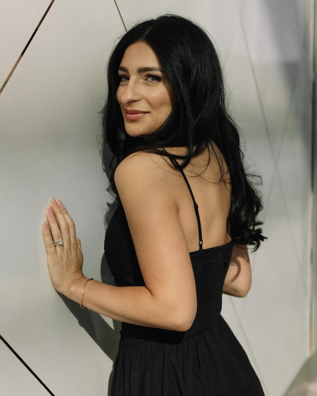 A woman in a black dress stands confidently. She leans against a modern wall with sharp angles and clean lines. Her long hair flows freely. A warm smile lights up her face. She gazes over her shoulder, inviting connection.