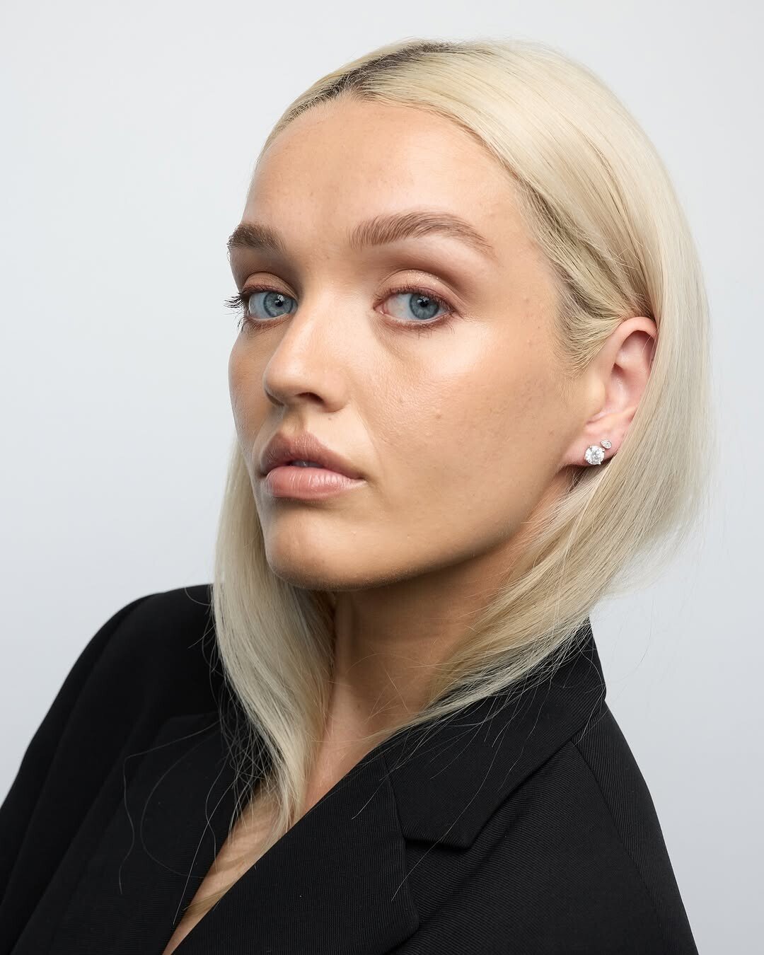 A woman with straight, platinum blonde hair stands confidently in a black blazer. Her blue eyes draw attention. Sparkling earrings add elegance. This image showcases professional style. Black blazers often symbolize authority and sophistication. They are staples in fashion, especially in business contexts.