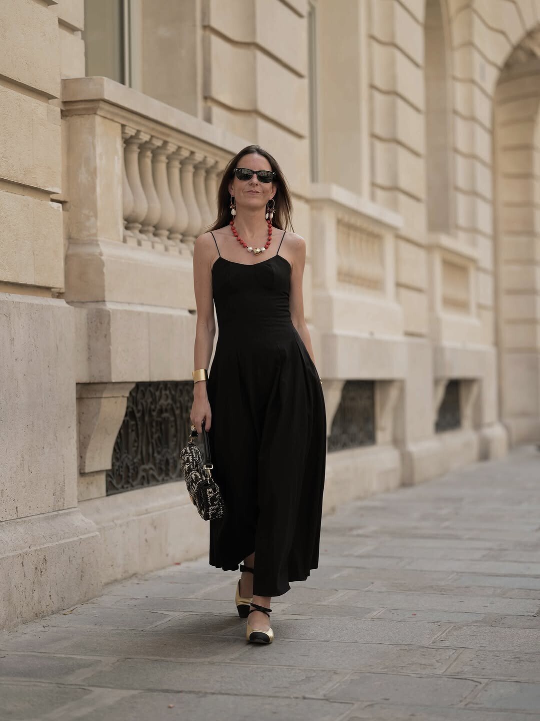 A stylish woman walks confidently, showcasing urban chic. Black maxi dress hugs her shape, flowing elegantly with each step. Bold jewelry pops against the dark fabric. Oversized sunglasses add flair, creating an air of mystery. Chic handbag complements her look, suggesting sophistication and practicality.
