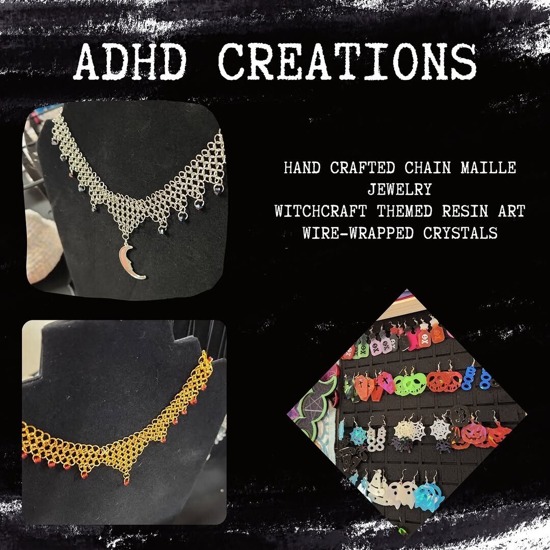 ADHD Creations shines with creativity. Handcrafted chain maille jewelry, resin art, and wire-wrapped crystals reflect individual expression. Each piece tells a story. The silver necklace with a crescent moon evokes mystery and spirituality. Yellow necklace bursts with energy, suggesting joy and optimism. Colorful accessories arranged thoughtfully create visual harmony.