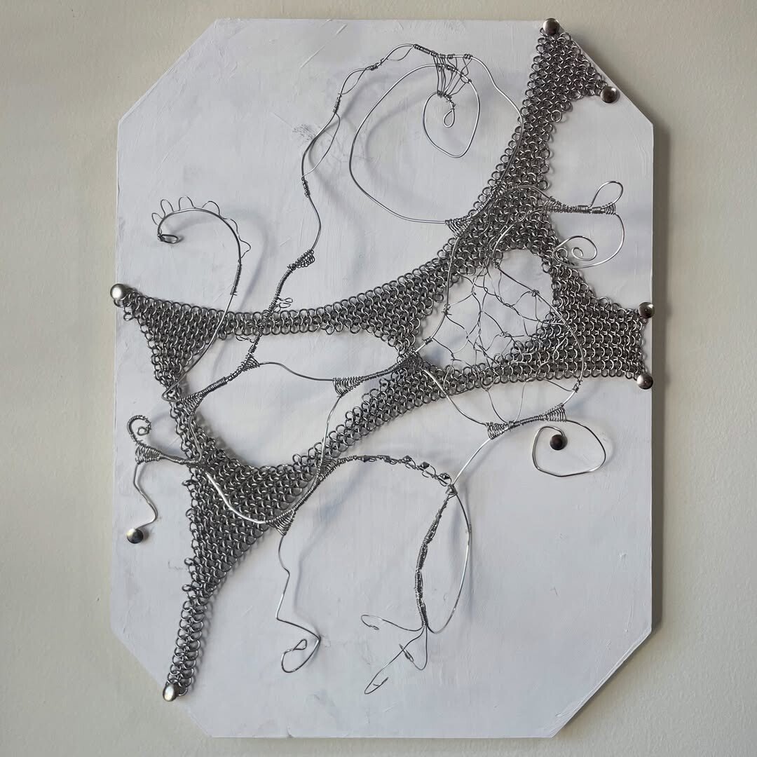 The octagonal background shines bright. White contrasts with intricate wire sculptures. These twisting forms create movement. They dance in space, inviting viewers to explore. Negative space plays a key role. It highlights shapes and shadows, adding depth. Metallic textures glint and shine. Art reflects ideas of dynamism and fluidity.