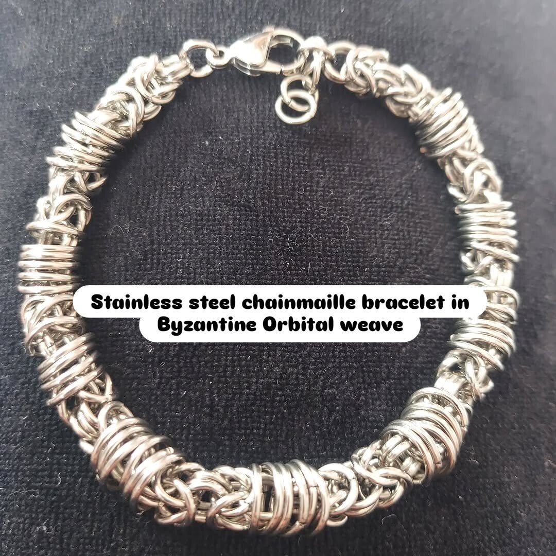 Stainless steel shines brightly. Bracelet features Byzantine Orbital weave. Rings connect seamlessly, creating a flowing pattern. This design shows craftsmanship and attention to detail. Each ring interlocks perfectly. The texture adds depth.
