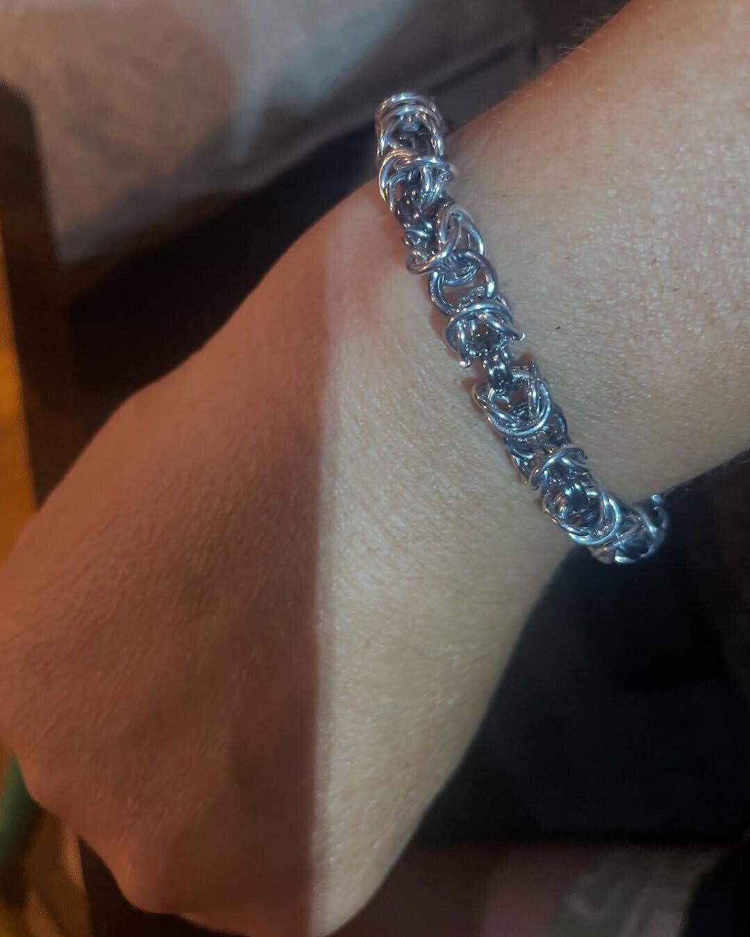 Historically, chainmail has roots in protection. Now, it transforms into fashion. This bracelet tells a story of evolution. It combines traditional techniques with modern flair. A beautiful piece that celebrates individuality.