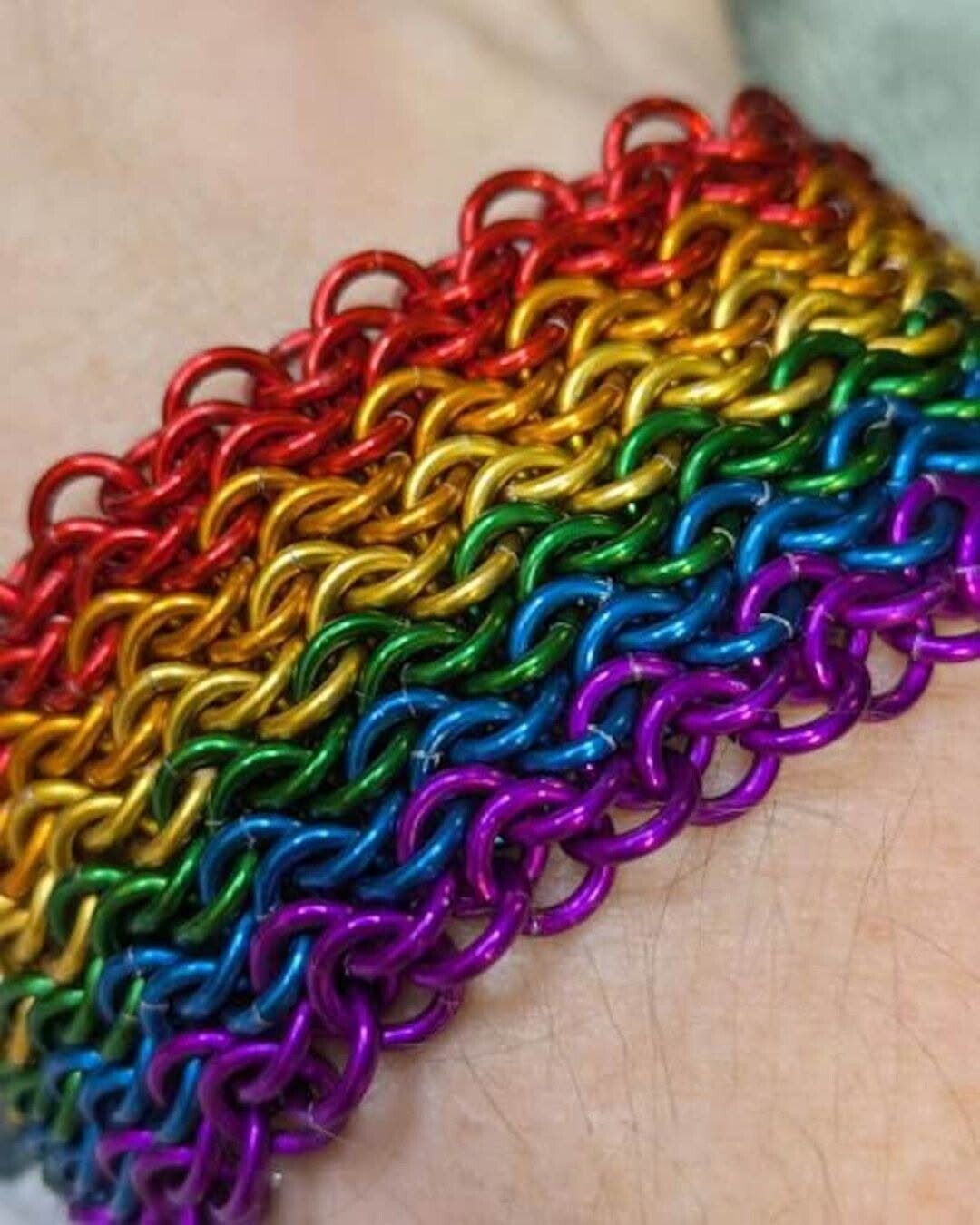 Vibrant colors pop. Chainmail bracelet shines, showcasing creativity and craftsmanship. Interconnected metallic rings create a stunning gradient. Red, orange, yellow, green, blue, and purple flow seamlessly together. Each color represents emotions and ideas. Red symbolizes passion, while blue often suggests calmness.