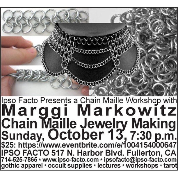 Promotional poster highlights chain maille jewelry workshop. Marggi Markowitz leads on October 13 at 7:30 p.m. at Ipso Facto, Fullerton, California. Fee is $25. Simple yet effective design grabs attention. Chain maille, a technique with roots in medieval armor, transforms into art. Jewelry connects history with modern creativity. Gothic apparel and occult supplies are referenced, appealing to niche audiences. This blend of styles fosters community among enthusiasts.