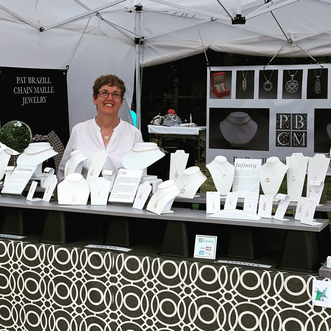A smiling woman stands proudly behind her jewelry booth. Displayed are beautiful necklaces and pendants, each on white stands that enhance their shine. The business name, “Pat Brazill Chain Maille Jewelry,” is visible on a colorful banner.