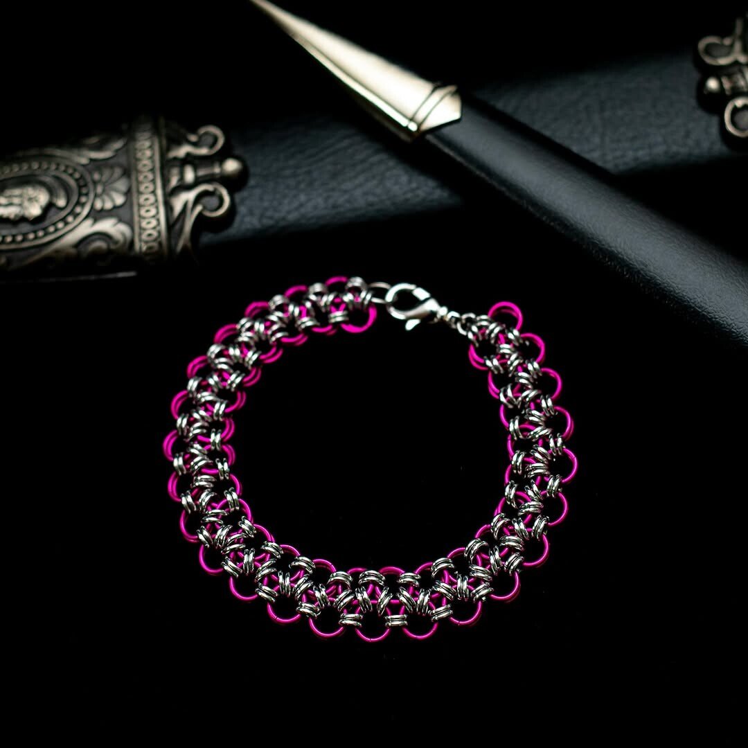 Chainmail bracelet shines brightly. Silver and pink links alternate. Each link connects, forming a strong yet delicate design. Craftsmanship is evident. Intricate patterns draw the eye.