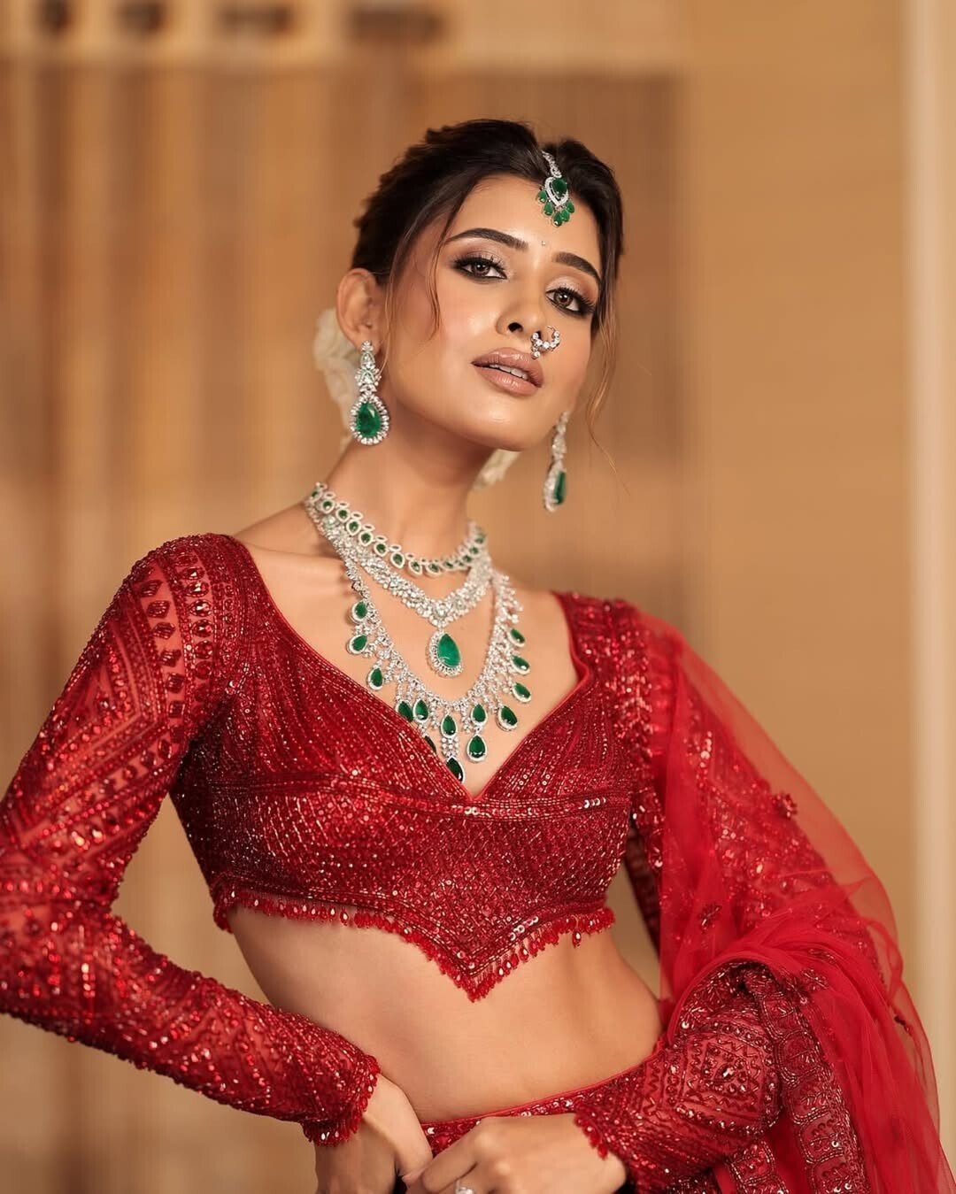 Elegant red outfit stands out. Intricate embellishments catch the eye. Color red symbolizes strength and passion in many cultures. Woman's poised expression shows confidence. Emerald jewelry adds a rich contrast. Statement necklace, earrings, nose ring—each piece tells a story. Jewelry often reflects heritage and personal identity. Softly blurred background enhances focus on her. This technique highlights beauty and elegance. Fashion connects deeply with culture. Traditional attire often carries history and significance. Each stitch holds meaning. The image showcases a blend of tradition and modernity. It invites viewers to appreciate craftsmanship. Style is not just about looks; it’s about expression. Every detail matters. This image speaks volumes about cultural pride and personal style.