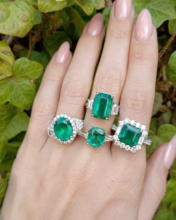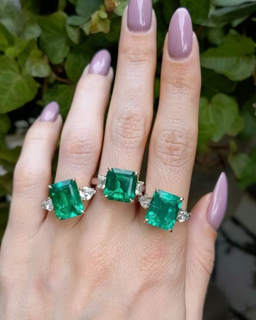 Emerald rings shine brightly. Green stones sparkle. Each gem has a unique cut, showcasing craftsmanship. The vibrant green of emeralds symbolizes growth and renewal. Nature's backdrop enhances their beauty. Lush leaves create a refreshing scene. Painted nails in soft lavender add a touch of elegance. This color contrast highlights the rings further.