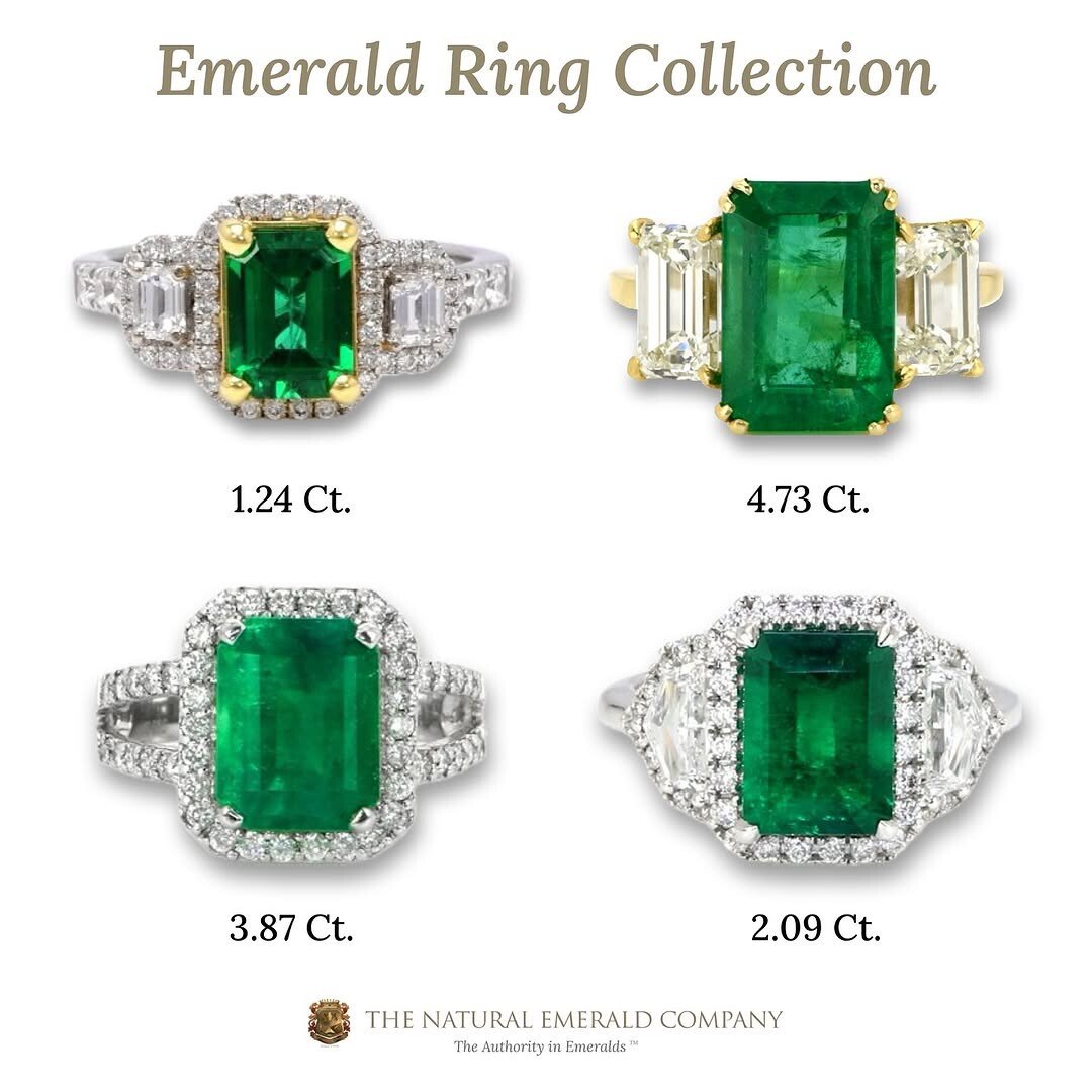 Four rings shine brightly. Each ring has a rectangular emerald. Colors pop. Emeralds range from 1.24 Ct to 4.73 Ct. Size matters. Larger stones often attract more attention. Each setting is unique, showcasing craftsmanship.