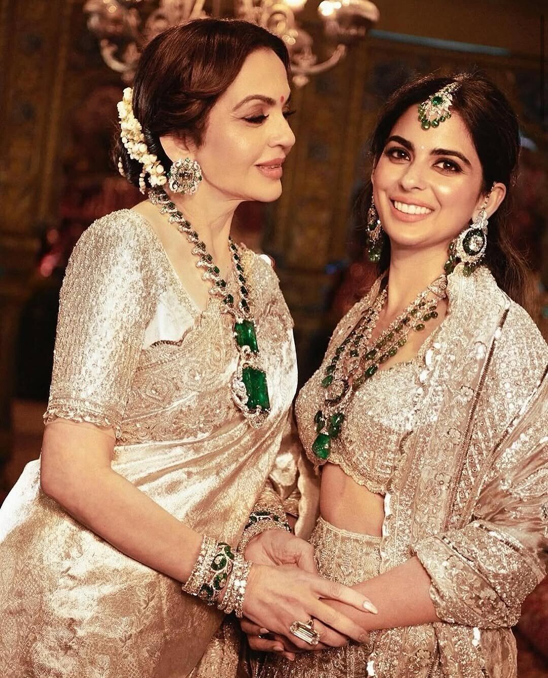 Two women shine in traditional attire. One wears a silver saree; the other dons a lehenga. Both outfits show rich cultural heritage through intricate designs. Jewelry sparkles, especially the large green gemstones. These gems often symbolize prosperity and growth in many cultures.