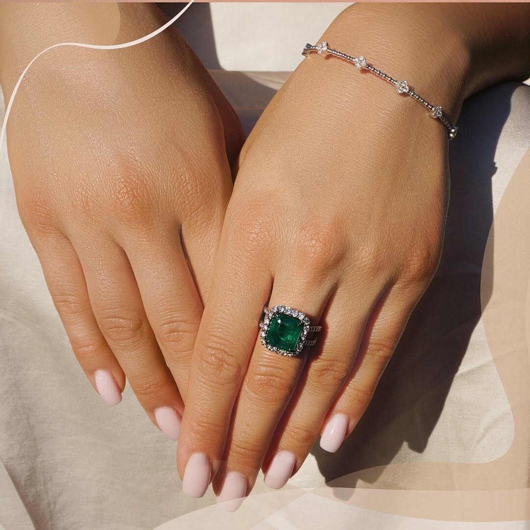 Two hands shine. They hold elegance. A square-cut emerald ring stands out. Its deep green hue attracts attention. Surrounded by smaller diamonds, it creates a stunning contrast. This design highlights craftsmanship. Halo settings are popular in jewelry. They enhance the center stone's beauty.