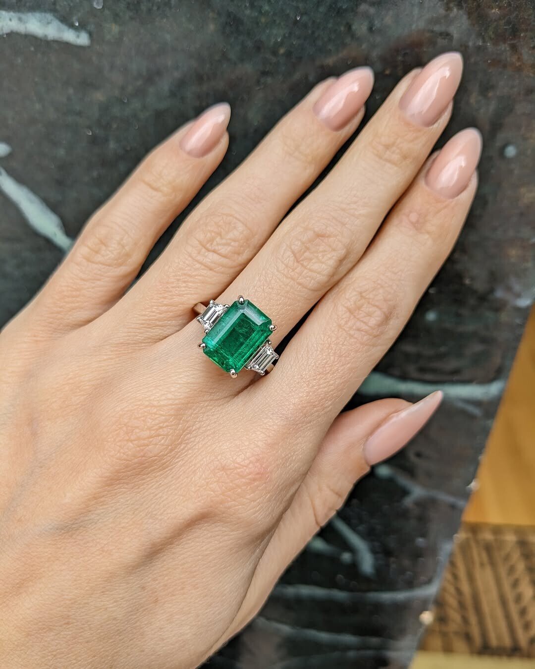 Elegant ring stands out. Emerald-cut emerald gleams at center. Its deep green color draws attention. Flanked by two rectangular diamonds, the contrast is striking. Diamonds add sparkle and sophistication. Silver band complements the stones well.