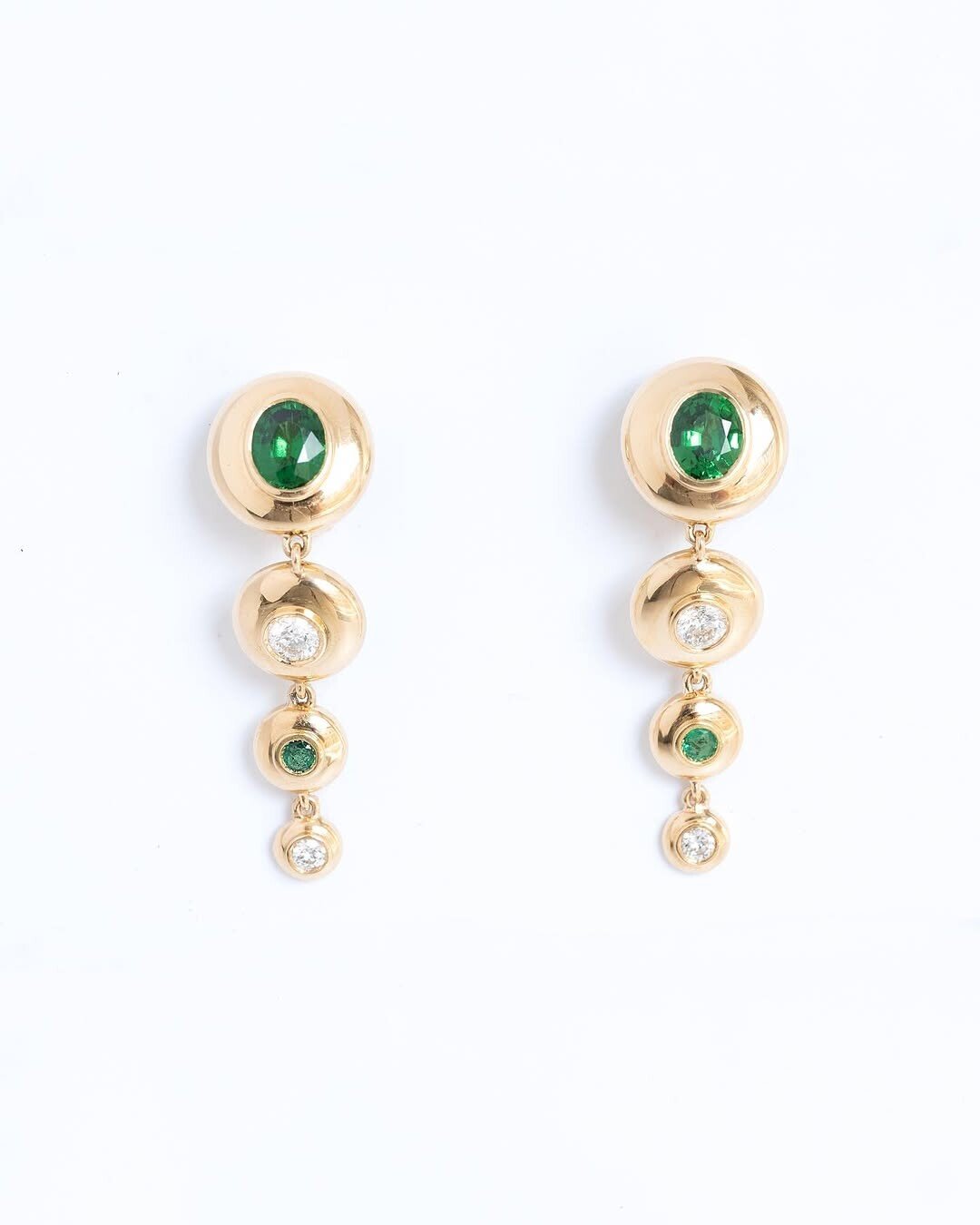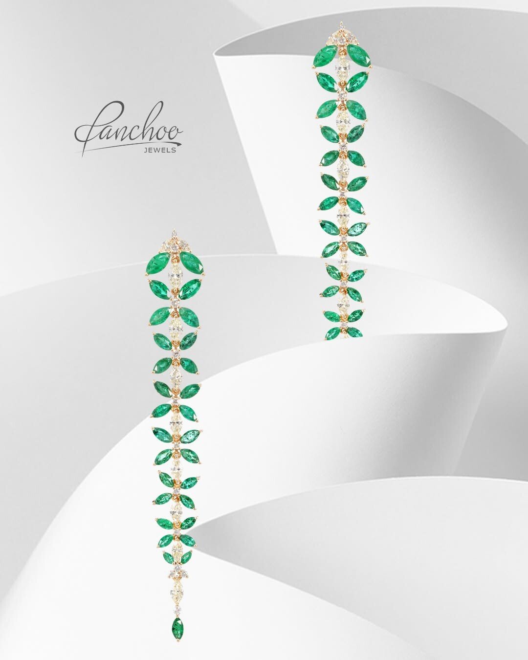 Gold earrings dazzle. They feature a cascade of green gemstones. Each stone shines brightly, drawing attention. Diamonds surround the gems, adding sparkle. The combination creates a stunning contrast against a white background.