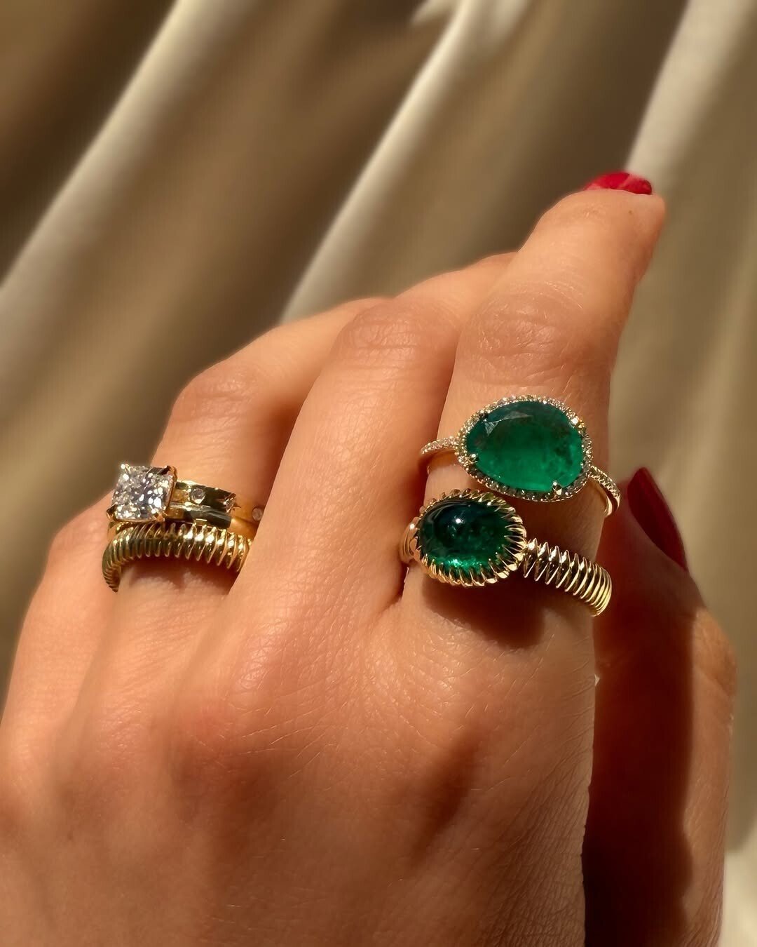 In jewelry, emeralds are prized. They have a rich history, linked to royalty and love. These rings are not just accessories; they are treasures. This image captures that essence perfectly.